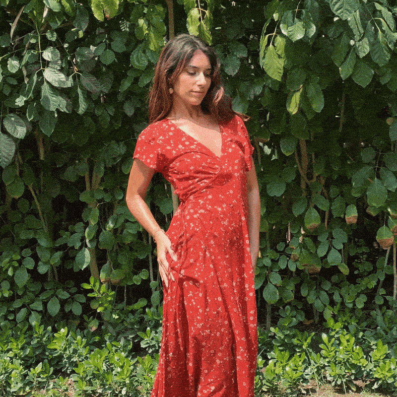 Feel the floral fantasy! The Rhea Wrap Dress in red combines a classic wrap style with a fresh, blooming print that'll leave you looking fabulous day or night.