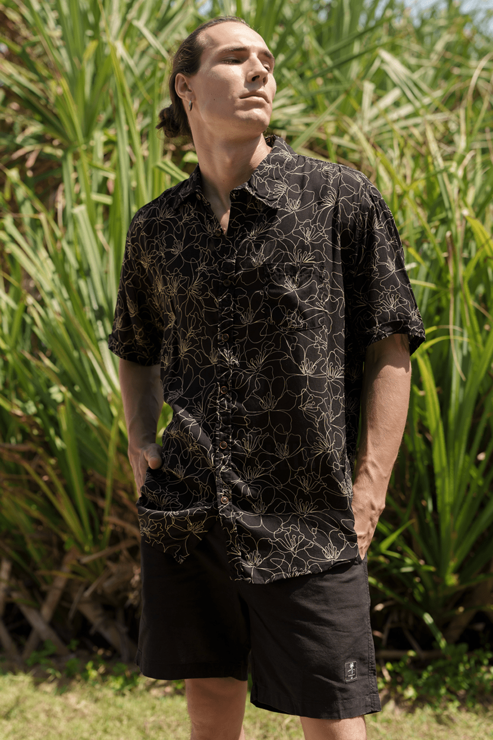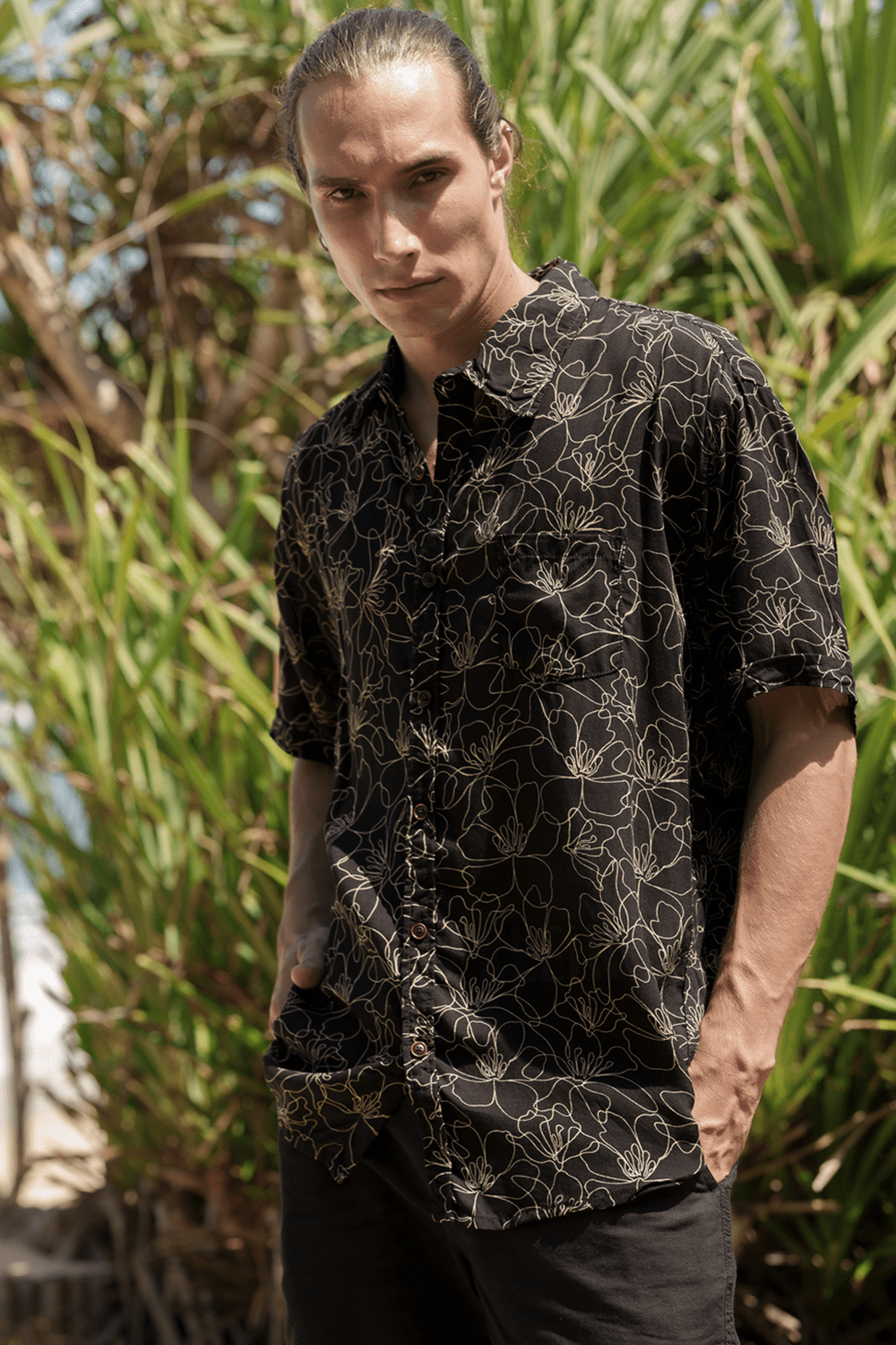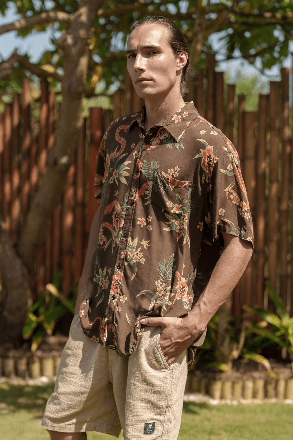 A relaxed summer shirt crafted from breathable rayon voile, featuring the bold Snake Flower print. With its short sleeves and button-up design, it’s perfect for effortless, warm-weather style.