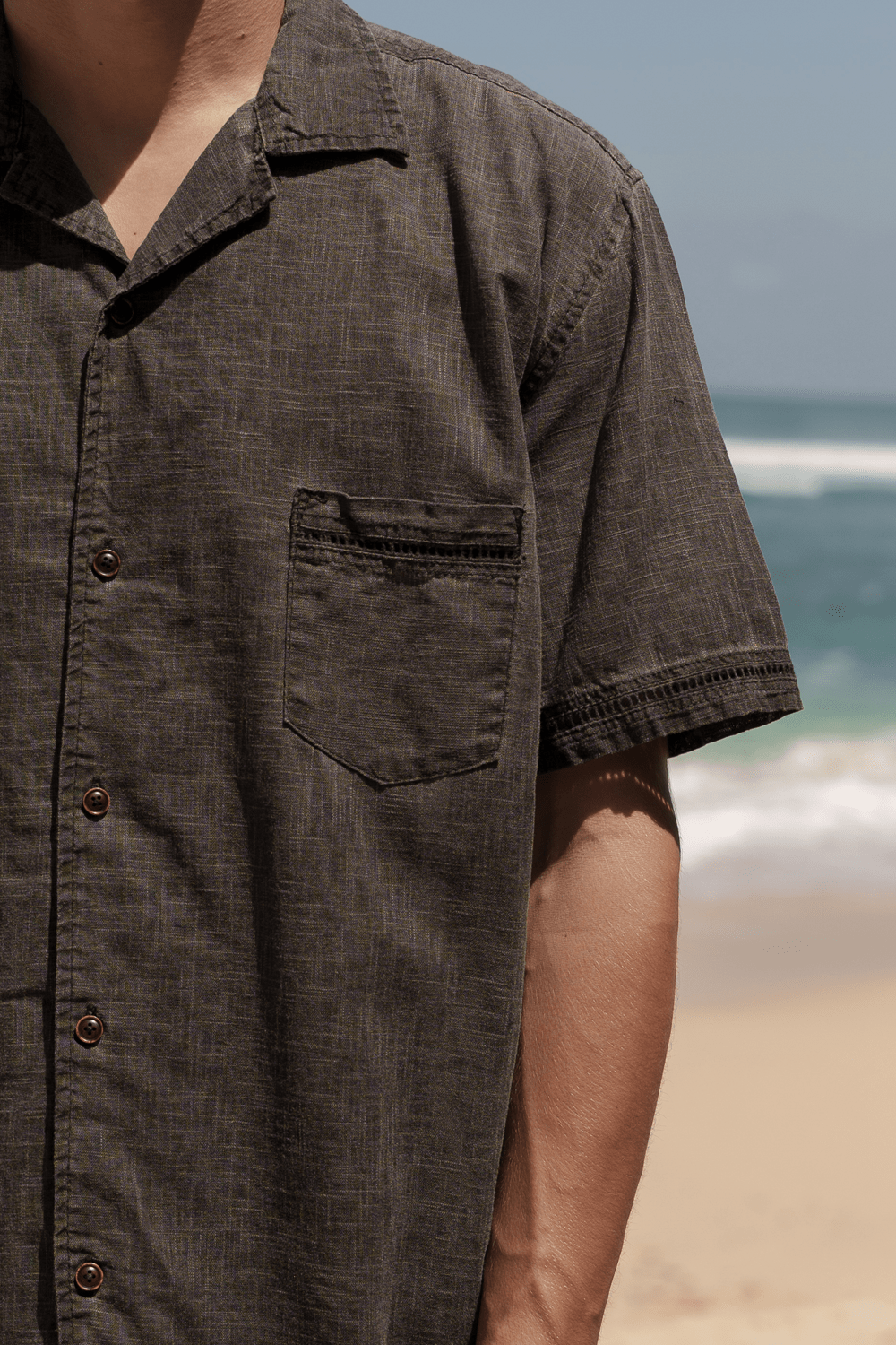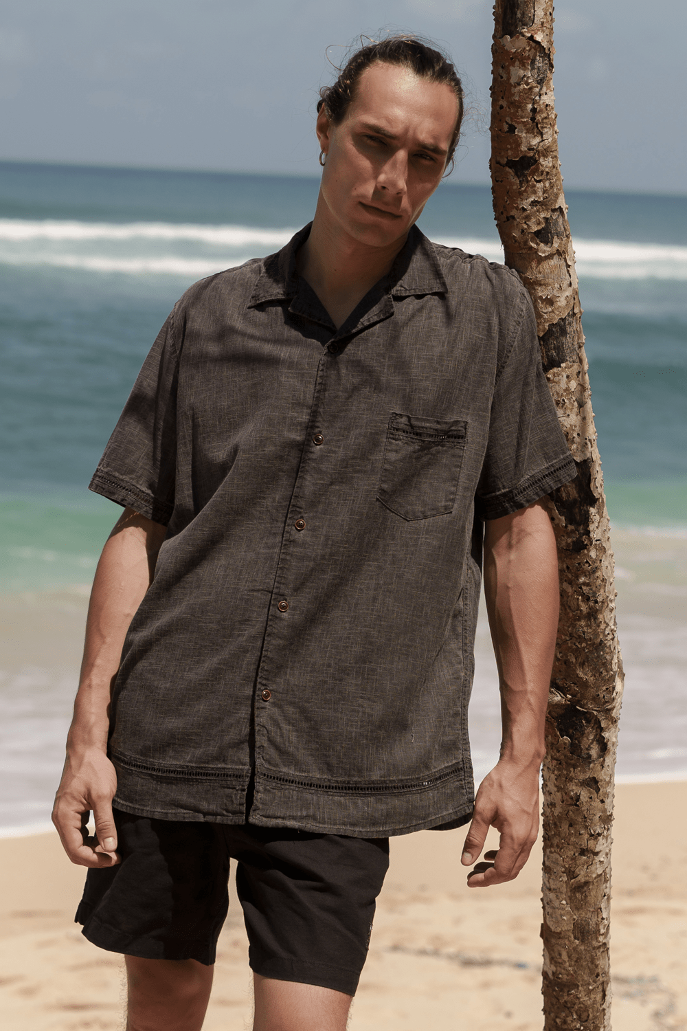 The Trim Shirt in Charcoal features short sleeves, a button-up front, and an all-over lace texture for a refined, breathable fit.